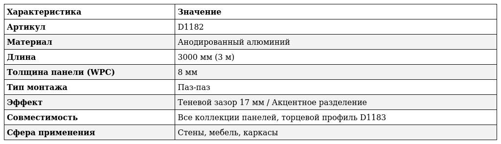 • Техническая совместимость: Профиль D1182 идеально стыкуется с торцевым профилем D1183 (через несложный выпил внутренней части), что позволяет создавать эстетически завершенные узлы примыкания любой сложности.