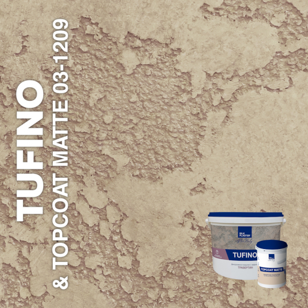 Фактурная декоративная штукатурка TUFINO на известковой основе с натуральным мраморным среднезернистым наполнителем предназначена для создания покрытий с эффектами травертина, известняка, микроцемента, оштукатуренной стены и другими. Материал на водной основе, без запаха, безопасен для людей и окружающей среды. В комплексе с защитным покрытием Topcoat MATTE штукатурка TUFINO создает влагостойкое, неприхотливое в эксплуатации, долговечное покрытие.