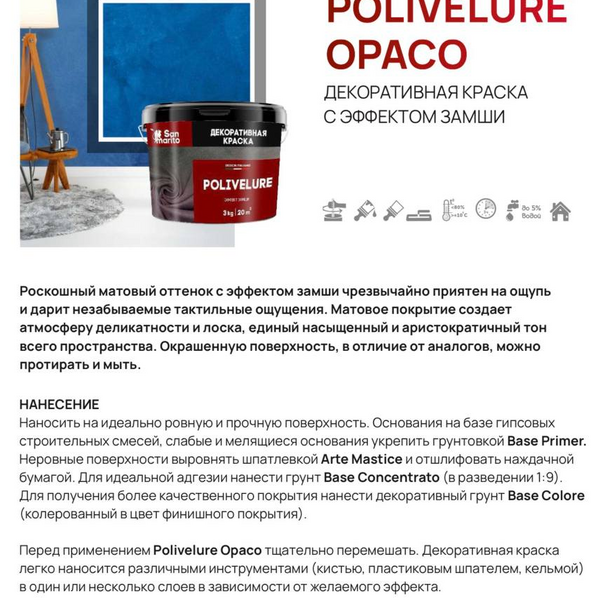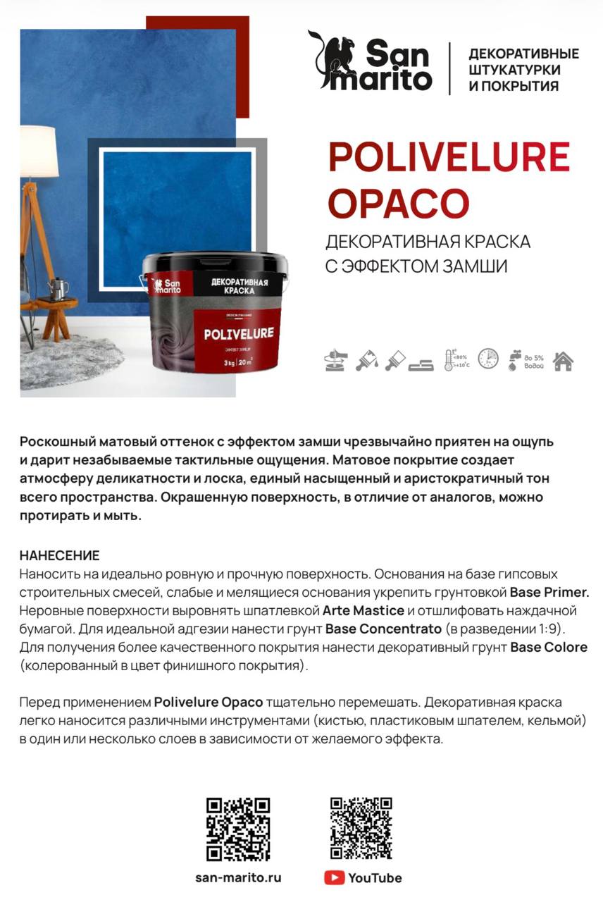 Создайте интерьер, который хочется чувствовать, с декоративной краской San Marito Polivelure Opaco от Decopro.by!