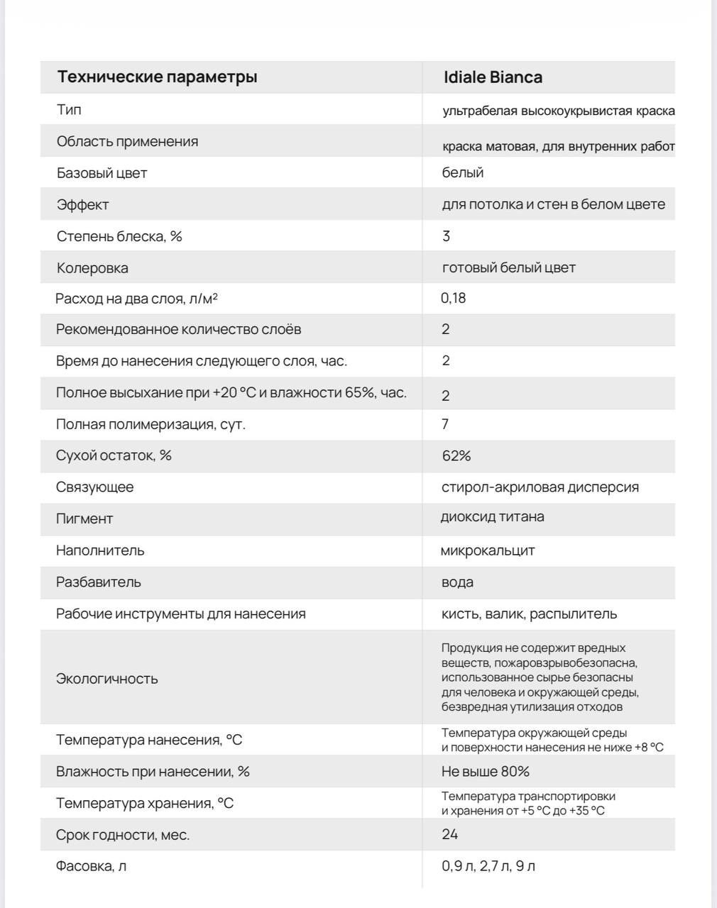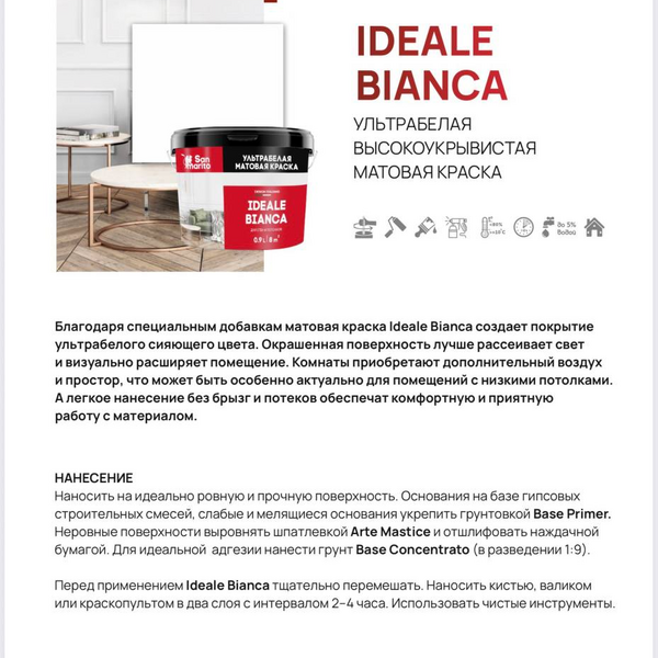 3. Применение: Перед использованием тщательно перемешайте Ideale Bianca. Наносите в два слоя с интервалом в 2 часа при температуре не ниже +8 °C.
