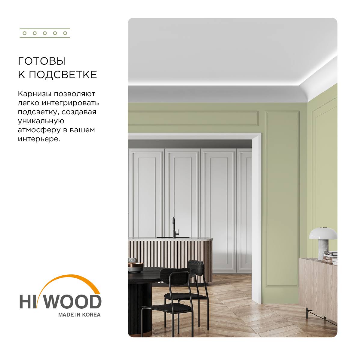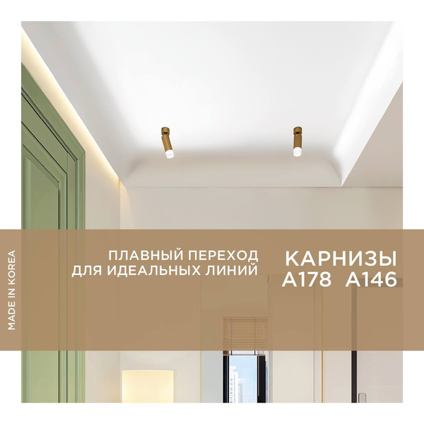 Карниз из полистирола HiWood, Корея. Полистирол - высокопрочный термопластичный полимер, отличающийся особой плотностью, что делает его влагостойким и износостойким. Карниз из этого материала очень удобен в работе. Для его крепления к стене подойдёт любой универсальный клей типа жидкие гвозди для изделий из полистирола. Как и аналоги, HiWood идёт белым, подходит под покраску. Качество корейского полимера ни чуть не хуже европейских аналогов.
