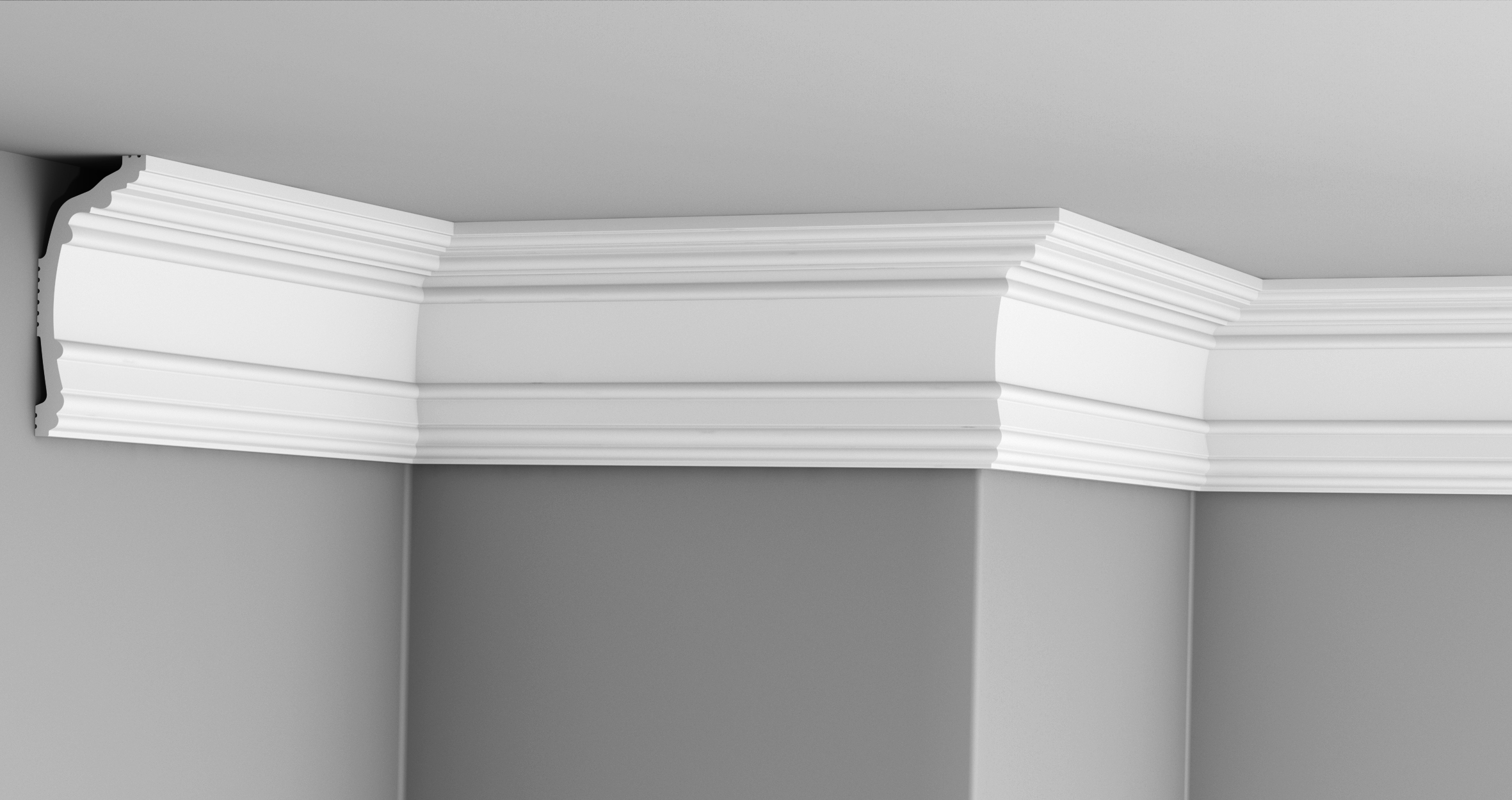 • Внушительный размер (100 мм): Высота 100 мм делает карниз заметным элементом декора, который гармонично смотрится как в просторных залах, так и в спальнях со стандартной высотой потолков.