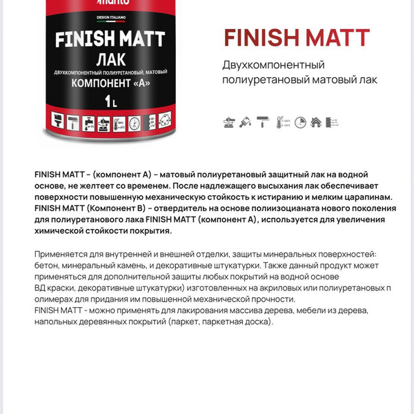 3. Finish Matt: Двухкомпонентный полиуретановый лак, обеспечивающий защиту от воды, царапин и бытовой химии.