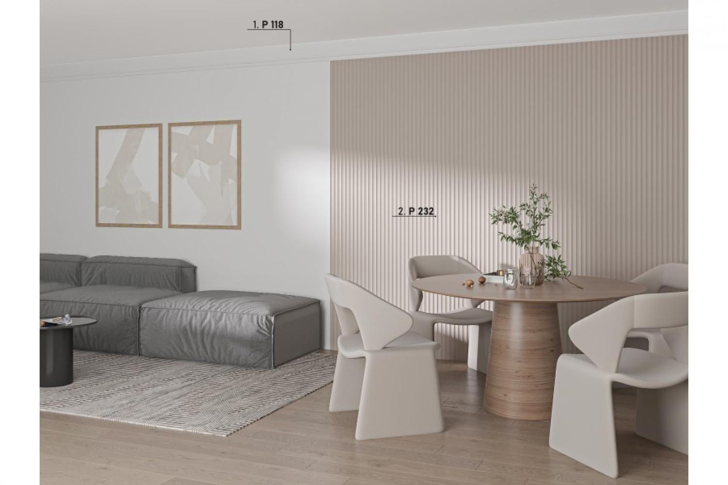 Важной отличительной чертой изделия, является наличие дополнительных доборов. Это специальные молдинги выполненные в виде отдельных сегментов панели. Благодаря им отпадает потребность пилить панель вдоль, достаточно взять нужное количество молдингов и наростить недостающую ширину. Комплектующим молдингом в данном случае служит P237.